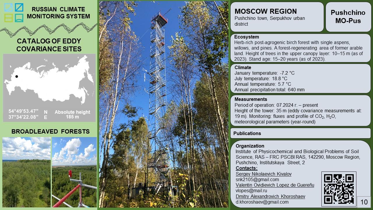 The staff of the V.N. Sukachev Laboratory of Biogeocenology of the A.N. Severtsov Institute of Ecology and Evolution of the Russian Academy of Sciences (IEE RAS), together with 45 co-authors from 22 scientific institutions, prepared a catalog of eddy covariance monitoring stations of Russia, providing information on observations of greenhouse gas flows between ecosystems and the atmosphere as of May 2025. The current version of the catalog includes information on 35 stations in ecosystems of various natural zones - from steppes to tundra.