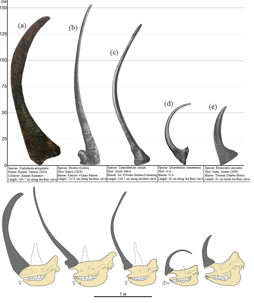 Thanks to permafrost preservation, numerous Russian museums have amassed a vast collection of woolly rhinoceros fossil horns. These finds date primarily to the second half of the Late Pleistocene and are tens of thousands of years old. A new study has shown that the nasal horn length of adult (over 15 years) woolly rhinoceroses averaged over 1 meter (with an average age in the sample of approximately 24 years). This is almost twice as long as the average length of the front horns of the white rhinoceros (55-60 cm) and 2.5-5 times longer than the horns of other modern rhinoceros species. A woolly rhinoceros horn discovered in 2024 on the banks of the Mustur-Yuryuye River turned out to be the longest rhinoceros horn known to date. Its length along the anterior curvature is 164.7 cm. This is 30.7 cm longer than the second-longest horn of Coelodonta antiquitatis and 6.6 cm longer than the longest known horn of a modern rhinoceros, which belonged to a female white rhinoceros shot over a century ago in South Africa (Figure 2). Like all nasal horns of woolly rhinoceroses, this horn is arched and curved significantly backward. Because of this, its length along the anterior curvature exceeds, and between the extreme points of the base and apex is shorter than the practically straight, when viewed from the side, record-breaking horn of the modern white rhinoceros (Figure 2). The mass of the anterior horns of the woolly rhinoceros was also greater than that of modern species. On average, the nasal horn of an adult woolly rhinoceros weighs just over 6 kg. This is slightly more than the average weight of the nasal horn of the white rhinoceros (just over 5 kg) and 3.5-11 times heavier than the horns of other modern rhinoceros species.