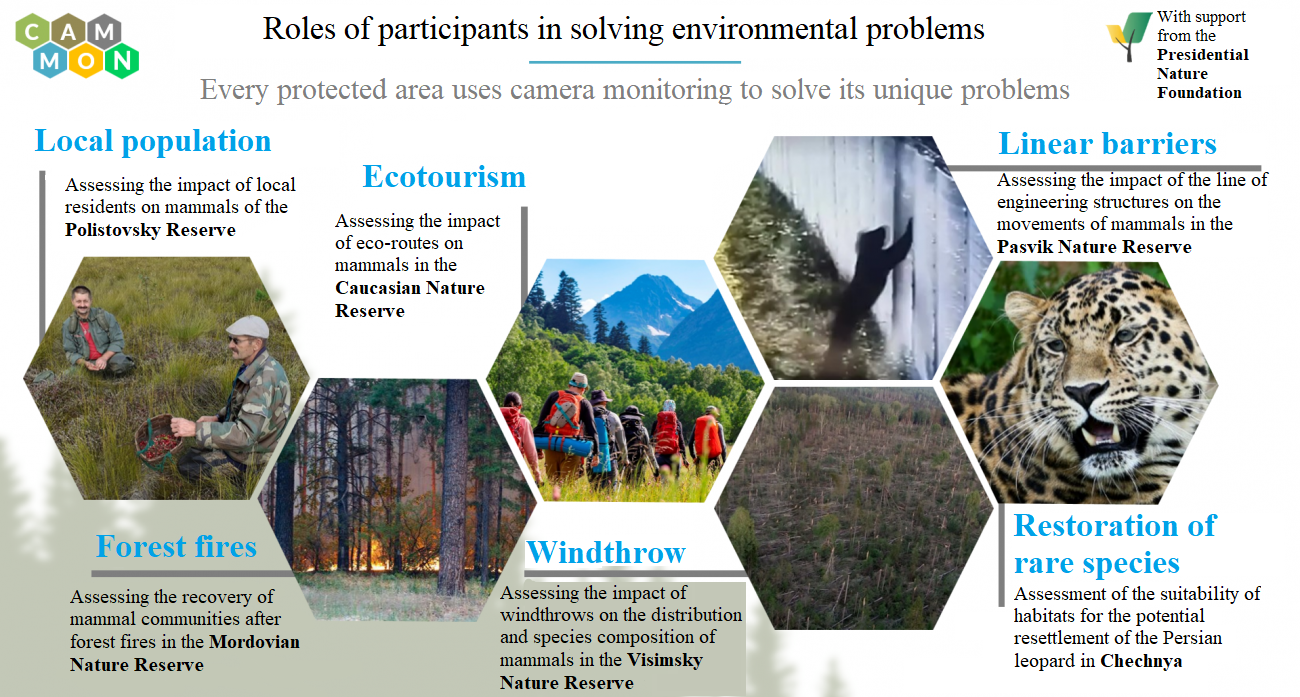 The project aims to create a unified system for monitoring biodiversity using camera traps and a common methodology. Seven protected areas are participating in the project: Polistovsky Nature Reserve (Pskov Region), Mordovsky Nature Reserve (Republic of Mordovia), Pasvik Nature Reserve (Murmansk Region), Visimsky Nature Reserve (Sverdlovsk Region), Kavkazsky Nature Reserve (Western Caucasus), Sovetsky Federal Wildlife Refuge (Chechen Republic), and the Central Forest Nature Reserve (Tver Region, hereinafter CFNR), which initiated the project. Each of the seven protected areas will address its own specific objectives within the project. Polistovsky Nature Reserve will organize interactions with local residents by assessing their impact on mammals within the reserve and the protected zone. Mordovsky Nature Reserve will begin monitoring the recovery of mammal communities after fires. Pasvik Nature Reserve will assess the impact of engineering structures on mammal migration. The Visimsky Nature Reserve will study how windfalls affect mammal populations in the mosaic landscapes of the Middle Ural lowlands. The Kavkazsky Nature Reserve will be able to observe the impact of mass tourism and resort development on mammals and develop mitigation mechanisms. The Sovetsky Federal Nature Reserve, supervised by specialists from the A.N. Severtsov Institute of Ecology and Evolution of the Russian Academy of Sciences (IEE RAS), will assess the habitat suitability for the reintroduction of the Persian leopard as part of its restoration program in the Russian Caucasus. Importantly, all of them will work using a unified methodology, actively exchange data, and publicly share successes, challenges, and observations throughout the project.