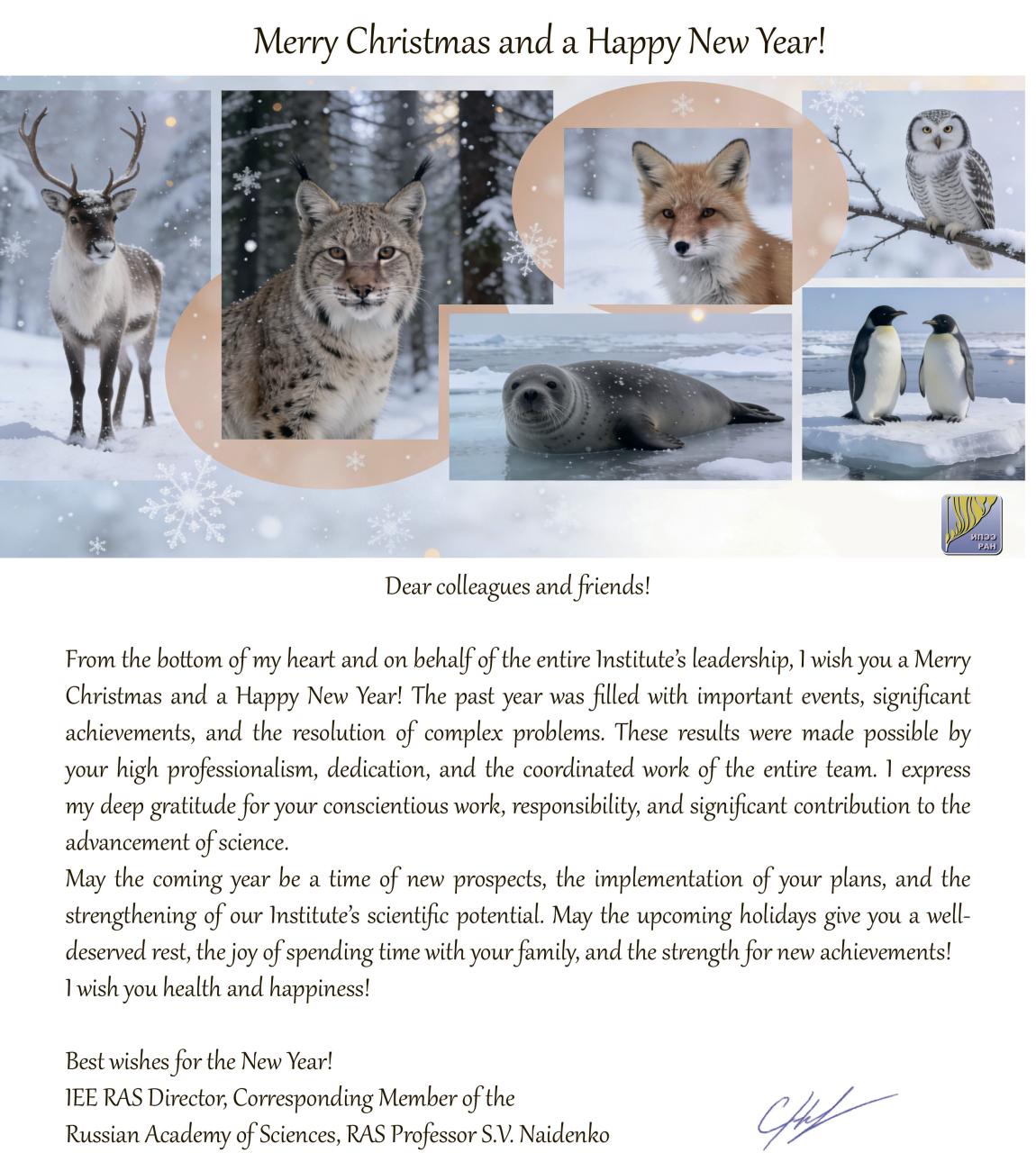 We sincerely congratulate you on the upcoming New Year! We wish you happiness, health, the fulfillment of your plans, exciting expeditions and research, and the strengthening of our Institute's scientific potential!