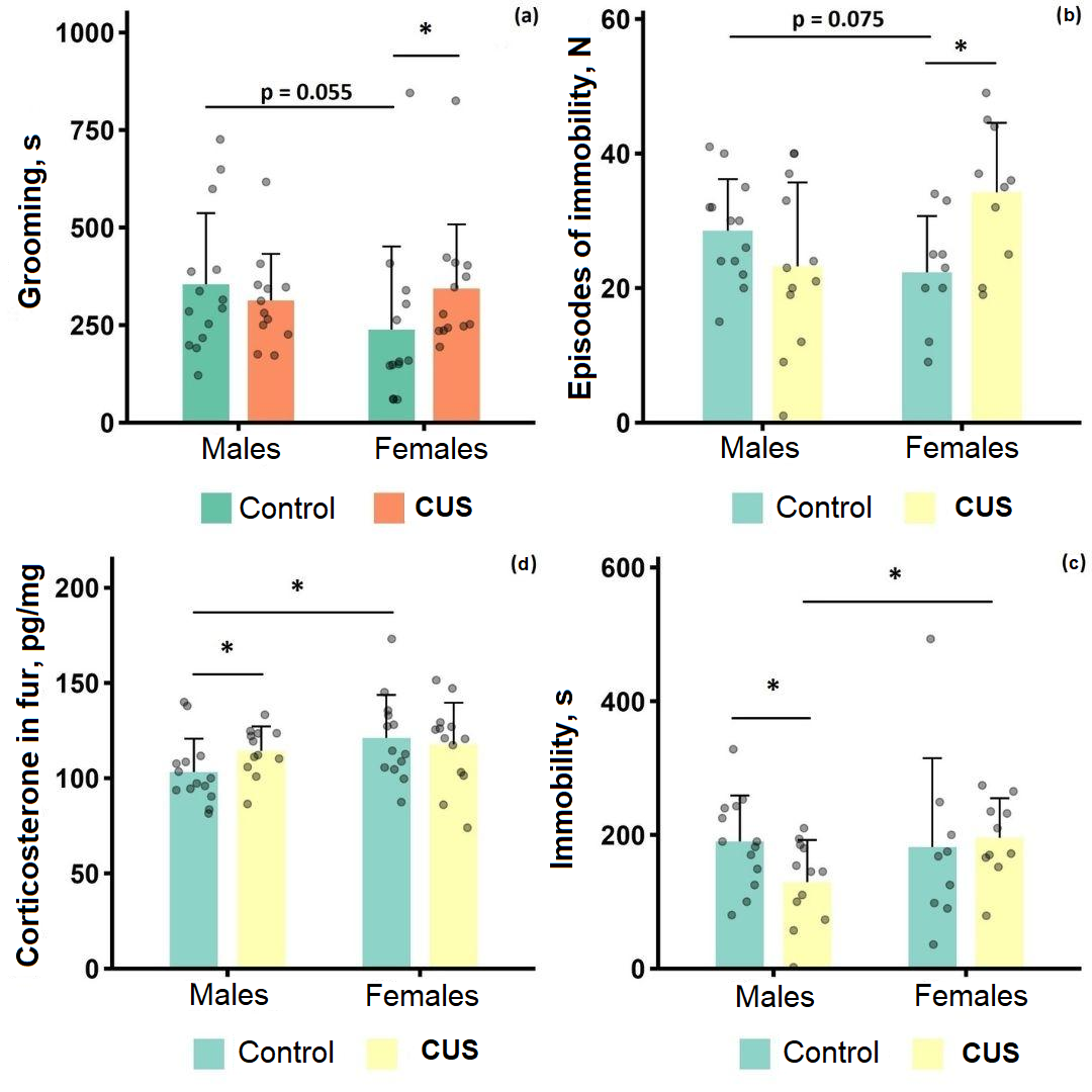 Overall, our observations of morphophysiological and behavioral changes suggest that, under identical experimental conditions, female house mice of natural origin are more vulnerable to chronic stress than males. This study was supported by the Russian Science Foundation grant 23-24-00414 (supervised by Senior Researcher V.V. Voznesenskaya).