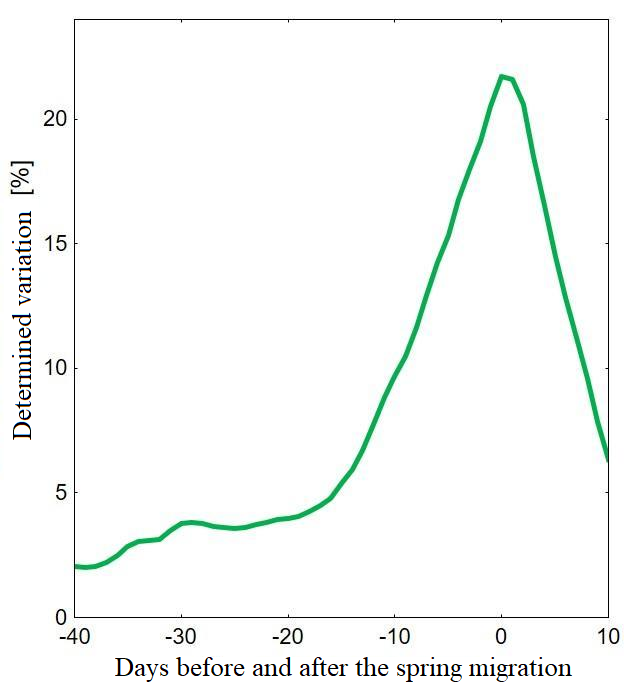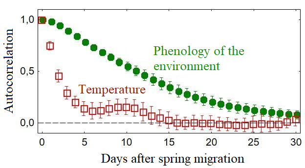 It is known that in a boreal climate, the development of any spring process - snowmelt, leaf budding, insect activity and their prey - depends on temperature. Crossing a threshold provides the initial impetus, the accumulated sum of temperatures determines the rate of development, which then proceeds independently, according to its own schedule. In this way, all spring processes are initiated sequentially, one after another, including those that determine food availability for birds. The set of parallel phenological processes forms the environmental phenology. It depends on the temperature of the previous period, although long-standing deviations are gradually "forgotten." The same is true for the future: environmental phenology predicts development, but the accuracy of the result decreases over time.