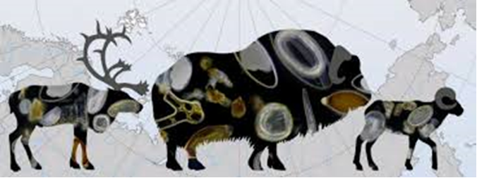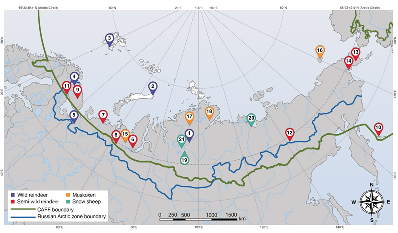 Рисунок, иллюстрирующий географическое расположение точек отбора проб. Фиолетовым цветом обозначены дикие северные олени, красным – домашние, оранжевым – овцебыки, бирюзовым – снежные бараны. Линия цвета хаки обозначает границу Арктики в понимании CAFF (Conservation of Arctic Flora and Fauna – рабочая группа по сохранению биоразнообразия), синяя – согласно АЗРФ (Арктическая зона Российской Федерации).