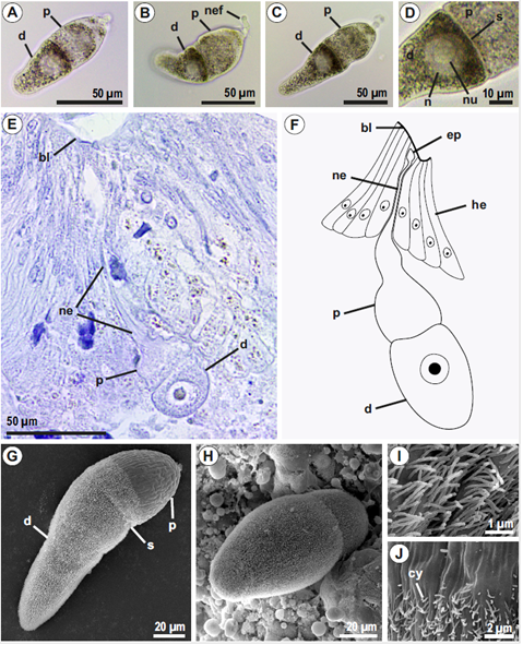 Рис. 1. Морфология Trichorhynchus efeykini sp. n. A, B — молодой трофозоит; C — трофозоит; D — средняя часть клетки трофозоита; E — гистолгический срез кишечного эпителия Thereuopoda longicornis с прикрепленным трофозоитом T. efeykini; F — схематическое изображение прикрепленного трофозоита, реконструированное по серии гистологических срезов; G — трофозоит, СЭМ; H — прикрепленный трофозоит, СЭМ; I — поверхность клетки трофозоита с многочисленными цитопилями; J — поверхность протомерита, где кончается покров из цитопилей; Обозначения: bl — базальная пластинка; cy — цитопили; d — дейтомерит; ep — эпимерит; he — энтероцит хозяина; n — ядро; nu — ядрышко; ne — шейка протомерита; nef — фрагмент шейки протомерита; p — протомерит; s — септа