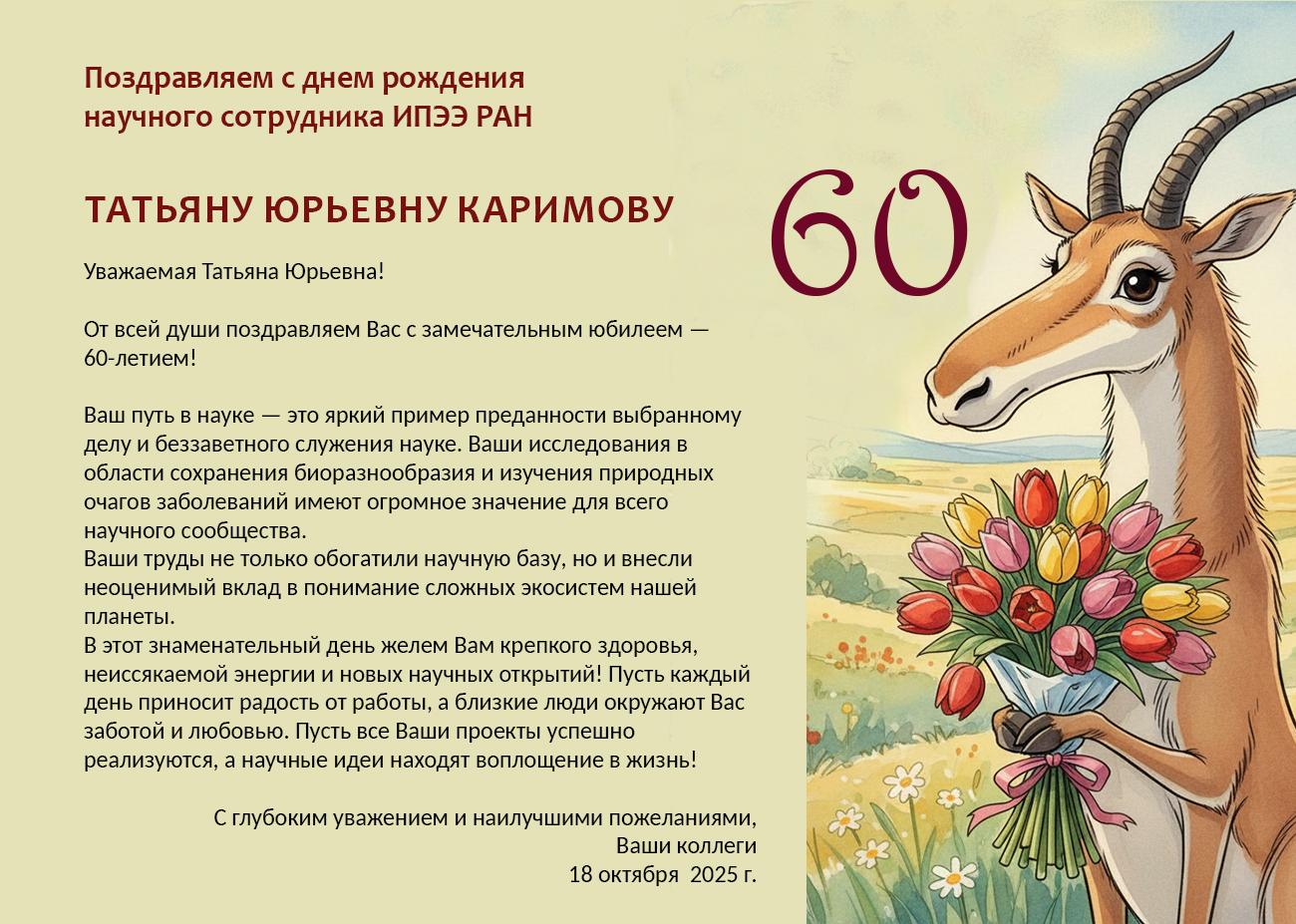 Коллектив ИПЭЭ РАН от всей души поздравляет Татьяну Юрьевну с 60-летием! Желаем крепкого здоровья, неиссякаемой энергии и успехов в научной деятельности!