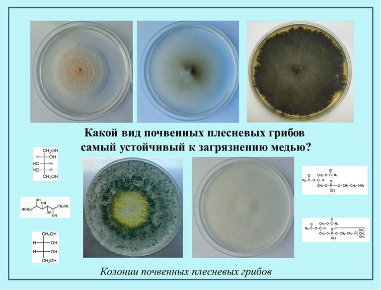 Для этого в Институте проблем экологии и эволюции им. А.Н. Северцова РАН (ИПЭЭ РАН) соместно с коллегами из Института микробиологии им. С.Н. Виноградского РАН было проведено исследование. Изучали влияние меди на важные биологические молекулы нескольких плесневых грибов – липиды и осмолиты. Липиды – жироподобные вещества, которые играют важную роль в строении и функционировании живых организмов. Именно липиды входят в состав главного защитного барьера любой клетки – клеточной мембраны. А осмолиты отвечают за стремление живых организмов к стабильности, несмотря на изменяющиеся внешние условия и стресс.