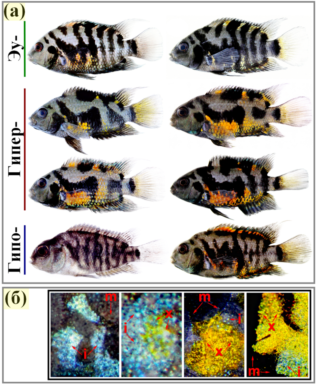 Рис. 2. Примеры изменчивости пигментного рисунка у самок Amatitlania nigrofasciata (а), выращенных в различных гормональных режимах: эутиреоидном (Эу-), гипертиреоидном (Гипер-) и гипотиреоидном (Гипо-). (б) Пример пигментных клеток, участвующих в процессе формирования желто-оранжевых ксантофорных элементов на теле (иридофоры (i), меланофоры (m) и ксантофоры (x)).