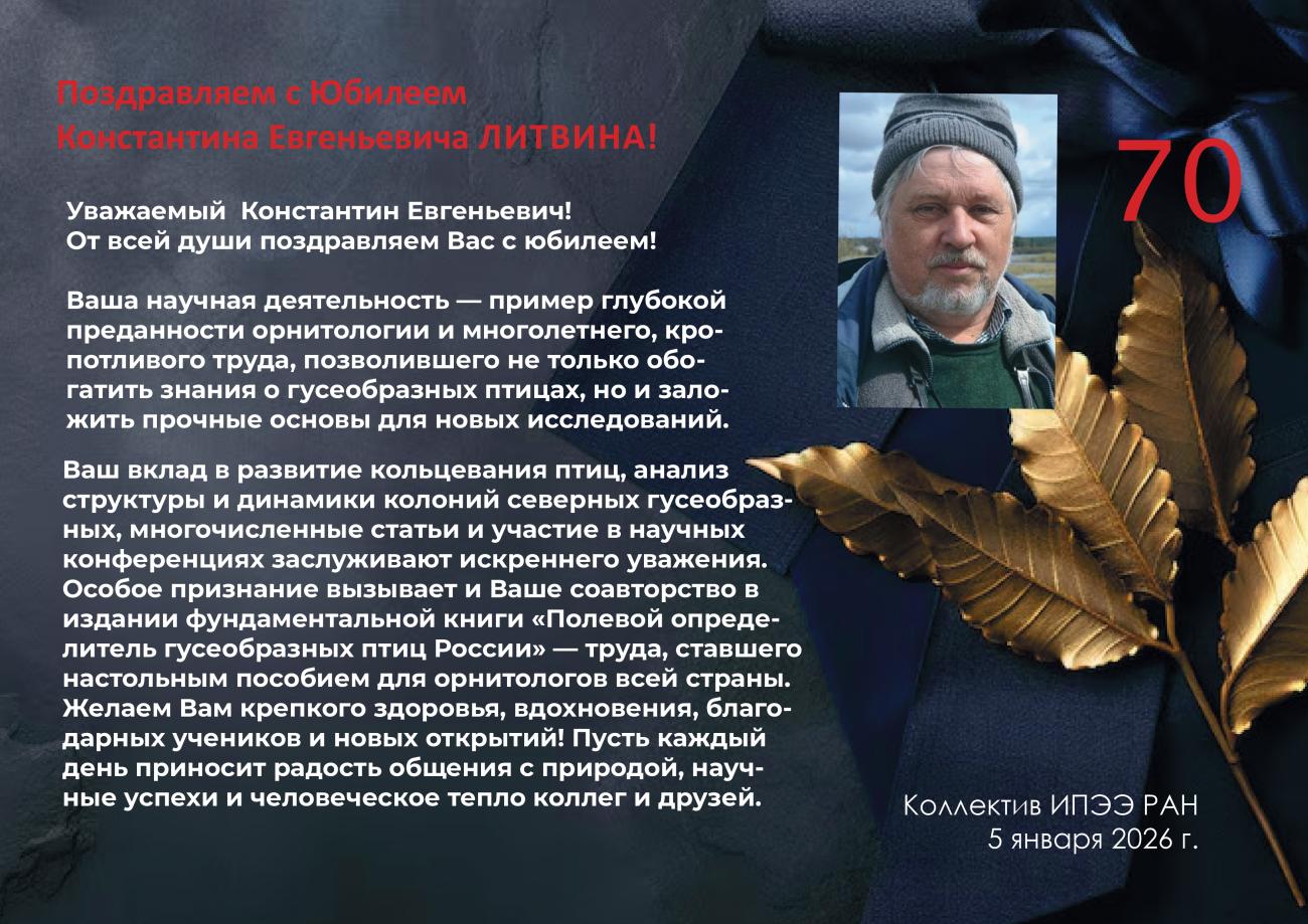 5 января 2026 г. – юбилей у Константина Евгеньевича Литвина, кандидата биологических наук, заведующего научно-информационного центра кольцевания птиц ИПЭЭ РАН. Константин Евгеньевич - автор многочисленных статей, участник конференций и соавторов научных изданий, в том числе книги “Полевой определитель гусеобразных птиц России”. Тема диссертации была посвящена структуру и механизмам формирования колоний северных гусеобразных.