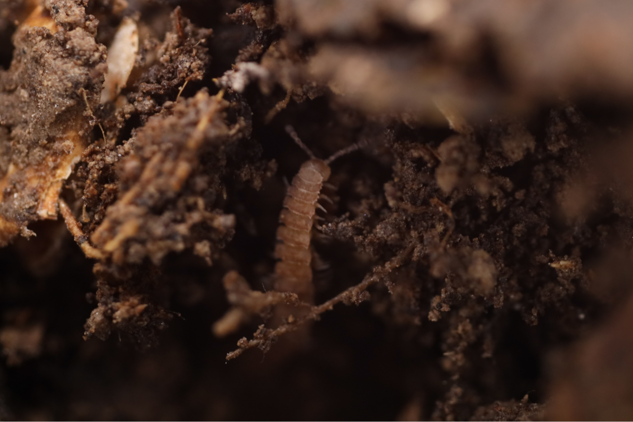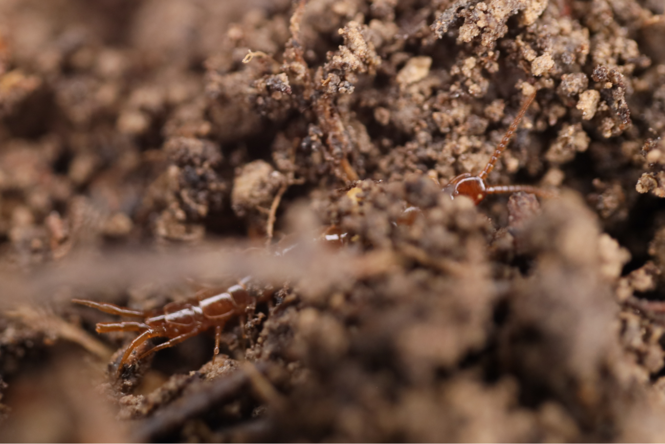 Численность хищников была существенно выше относительно сапрофагов в нарушенных лесах по сравнению с естественными, что указывает на скрытую дестабилизацию функционирования почвенных экосистем. Хищная многоножка-костянка в почве березняка. Фото Д.И. Коробушкина