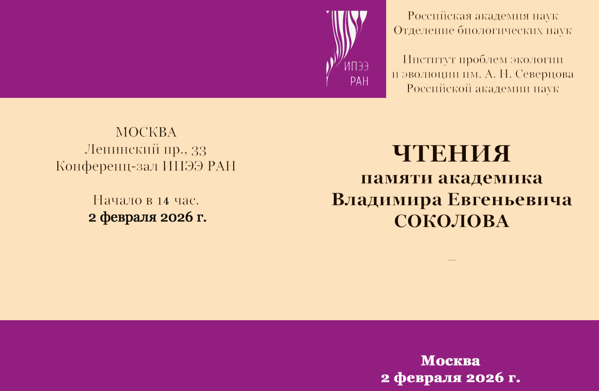 2 февраля в 14:00 в Конференц-зале ИПЭЭ РАН по адресу Москва, Ленинский пр. д.33 состоятся чтения памяти академика Владимира Евгеньевича Соколова.
