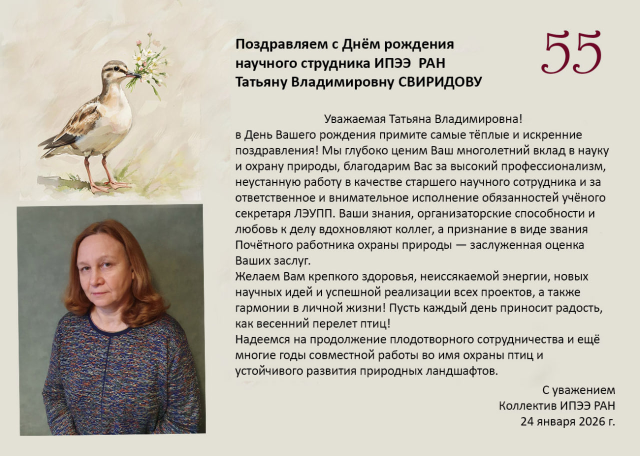 От всей души поздравляем Татьяну Владимировну с юбилеем, желаем успехов во всех начинаниях, интересных научных исследований и экспедиций!