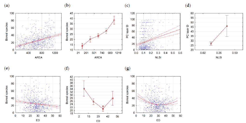 Важным результатом стало обнаружение нелинейных (квадратичных) зависимостей между метриками фрагментации и составом растительности. Например, доля бореальных видов сначала резко снижается при увеличении плотности границ, а затем стабилизируется при высоких уровнях фрагментации. Это указывает на пороговый характер реакции экосистем.
