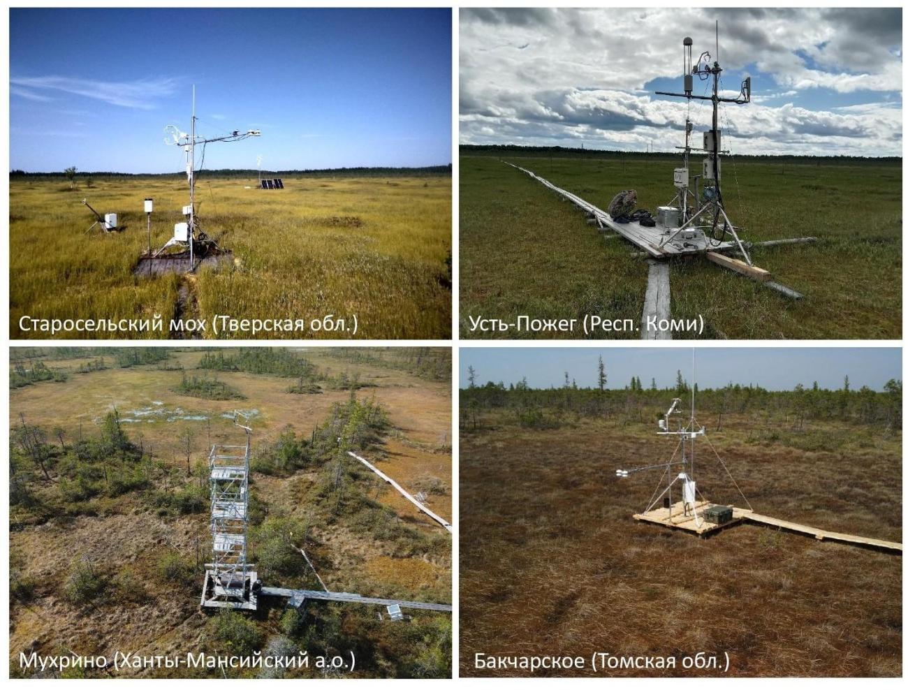 Эколого-климатические станции на объектах многолетнего мониторинга потоков СО2: болото «Старосельский мох» (Тверская обл., автор фото: Мамкин В.В.), болото «Усть-Пожег» (Респ. Коми, автор фото: Мигловец М.Н.), болото «Мухрино» (Ханты-Мансийский а.о. , автор фото: Дюкарев Е.А.), «Бакчарское» болото (Томская обл., Дюкарев Е.А.)