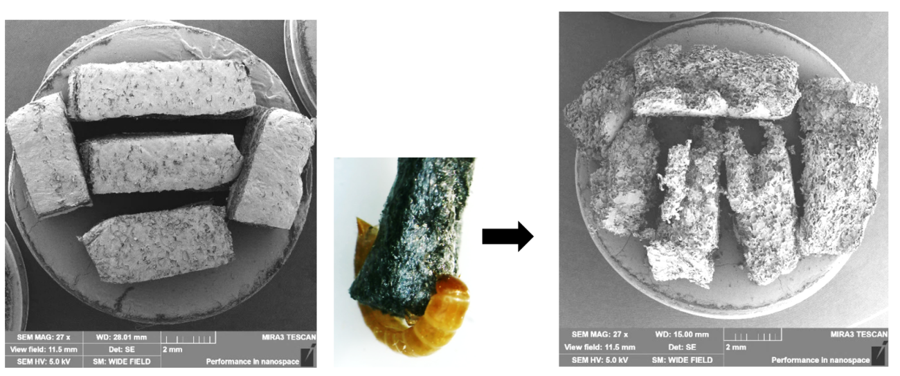 В лаборатории инновационных технологий Института проблем экологии и эволюции им. А.Н. Северцова РАН (ИПЭЭ РАН) ведутся активные работы по исследованию насекомых – деструкторов полистирола и механизмов его разложения. В ходе эксперимента авторами публикации было показано, что личинки жука-чернотелки Ulomoides dermestoides (Chevrolat, 1878) (Coleoptera: Tenebrionidae) способны осуществлять деструкцию вспененного полистирола (ВПС) в процессе своей пищевой активности.
