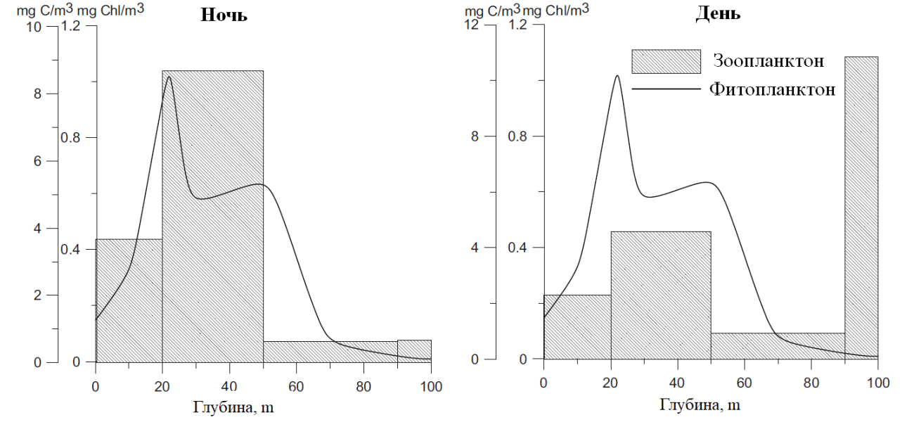 Пример вертикального распределения зоопланктона (mg C/m3) и фитопланктона (mg Chl/m3) в ночное время (левая панель) и в дневное время (правая панель) в водяной толще в северо-восточной части Черного моря (данные собраны в 2007 году). Профиль распределения фитопланктона усреднен за 24 часа. Высокая изменчивость распределения зоопланктона обусловлена ​​суточной вертикальной миграцией. Графики адаптированы из статьи: Farkas, J.Z., Morozov, A.Y., Arashkevich, E.G. and Nikishina, A., 2015. Revisiting the stability of spatially heterogeneous predator–prey systems under eutrophication. Bulletin of Mathematical Biology77(10), pp.1886-1908.