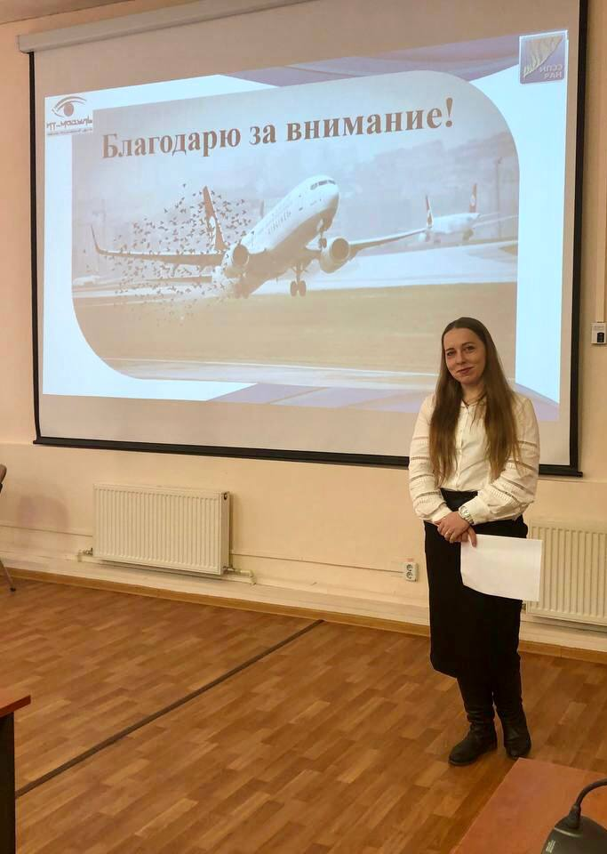 В.В. Кутилина выступила с докладом "Биоакустическое устройство для управления поведением птиц". На круглом столе также присутствовали представители таких организаций как ООО "Ладья", МГТУ ГА (Московский государственный технический университет Гражданской авиации), аэропорты "Шереметьево", "Внуково", "Жуковский", "Пулково" (Санкт-Петербург). На мероприятии обсуждались различные способы управления поведением птиц в рамках обеспечения безопасности полетов.
