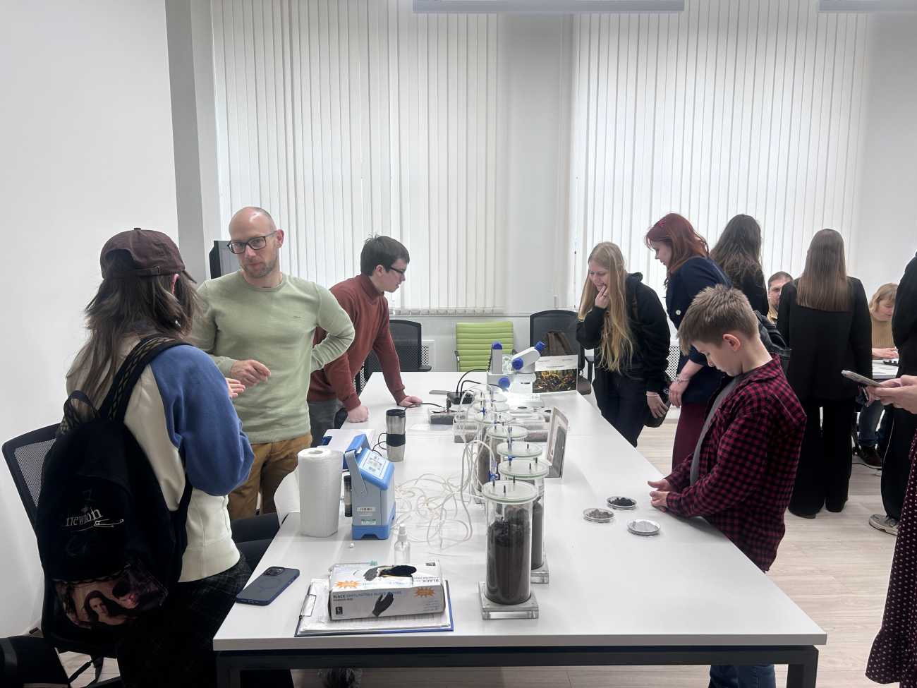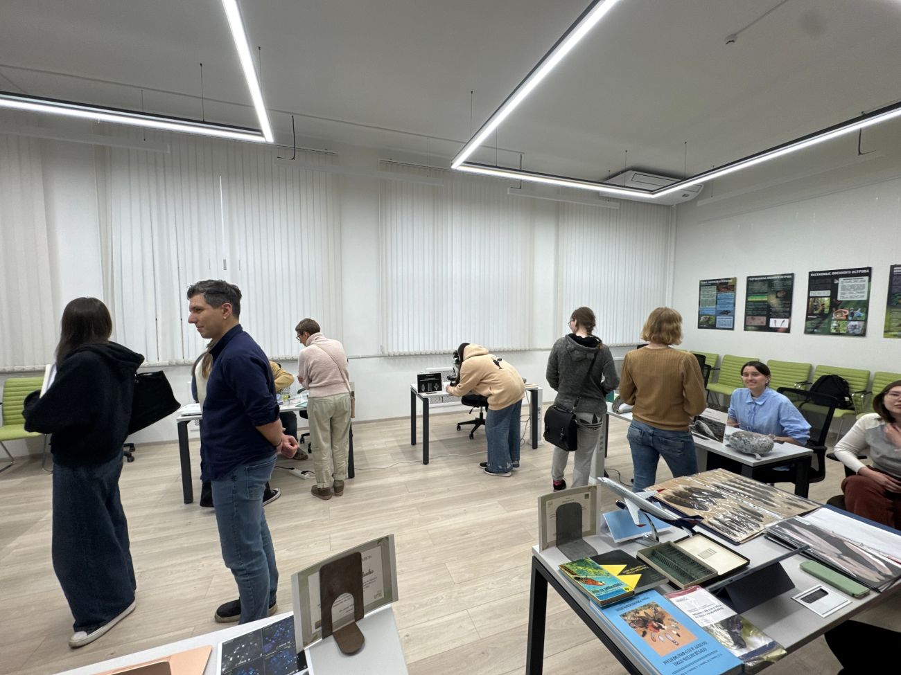 Параллельно экскурсиям в лаборатории ряд сотрудников института выставили столы с демонстрационным материалом: были представлены установки по оценке интенсивности дыхания почв, станции с микроскопированием по исследованию паразитов, водорослей и хромосом, показаны направления работ с птицами и морскими млекопитающими.